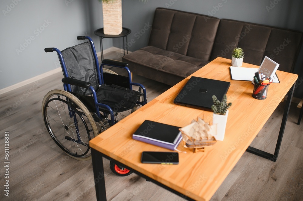 Empty Wheelchair In Black With Large Wheels And Manual Controls On Home Background Barrier Free Area Nobody Apartment Room House Medical Equipment Rental Copy Space Disabled Mobility Banner Stock Photo Adobe Stock